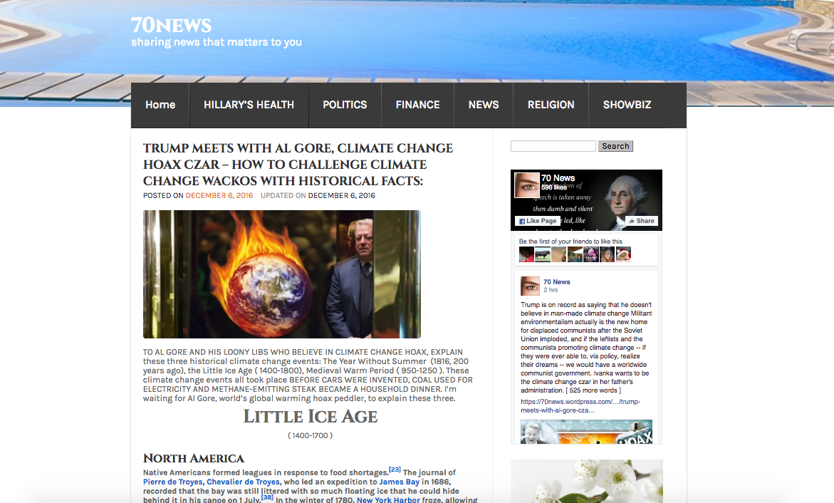Go to 70news.wordpress.com on a desktop browser, however, and you’ll find a generic WordPress blog that features a stock photo of a pool for a header, static images of flowers in the sidebar, and a default favicon. The site boasts a grand total of 594 fans on Facebook. In short, not credible or mainstream by any definition.